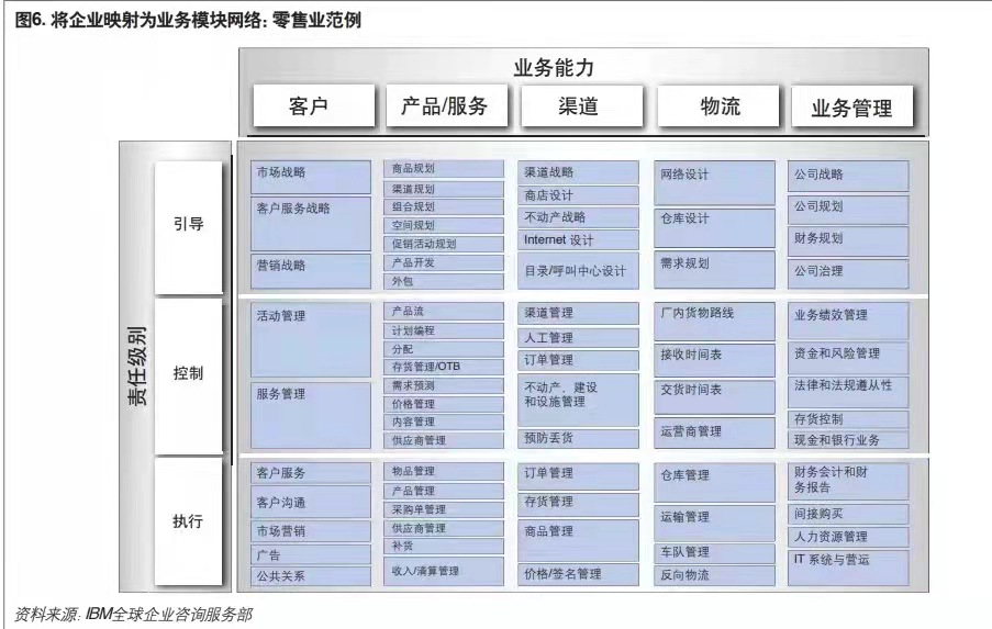 来自IBM的零售企业业务和信息化系统模块的映射示例,可以参考借鉴。