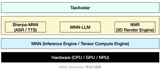 MNN-TaoAvatar 是基于 MNN 引擎构建而成的,它集成了 MNN-LLM、MNN-NNR 以及 Sherpa-MNN(包括 MNN-ASR 和 MNN-TTS)等多种算法模块。下图展示了这些模块在应用中的架构示意: