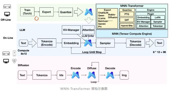 MNN-LLM 是基于 MNN 之上开发的 MNN-Transformer 模块的一个子功能模块,用于支持大语言模型与文生图等 AIGC 任务。它包含以下关键技术: