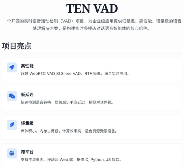 TEN VAD开源了! 一款企业级实时语音活动检测器,能精确到帧级别的语音活动检测,性能优于WebRTC VAD、Silero VAD TEN VAD和TEN Turn Detection搭配使用,构建AI实时对话语音助手无敌了。