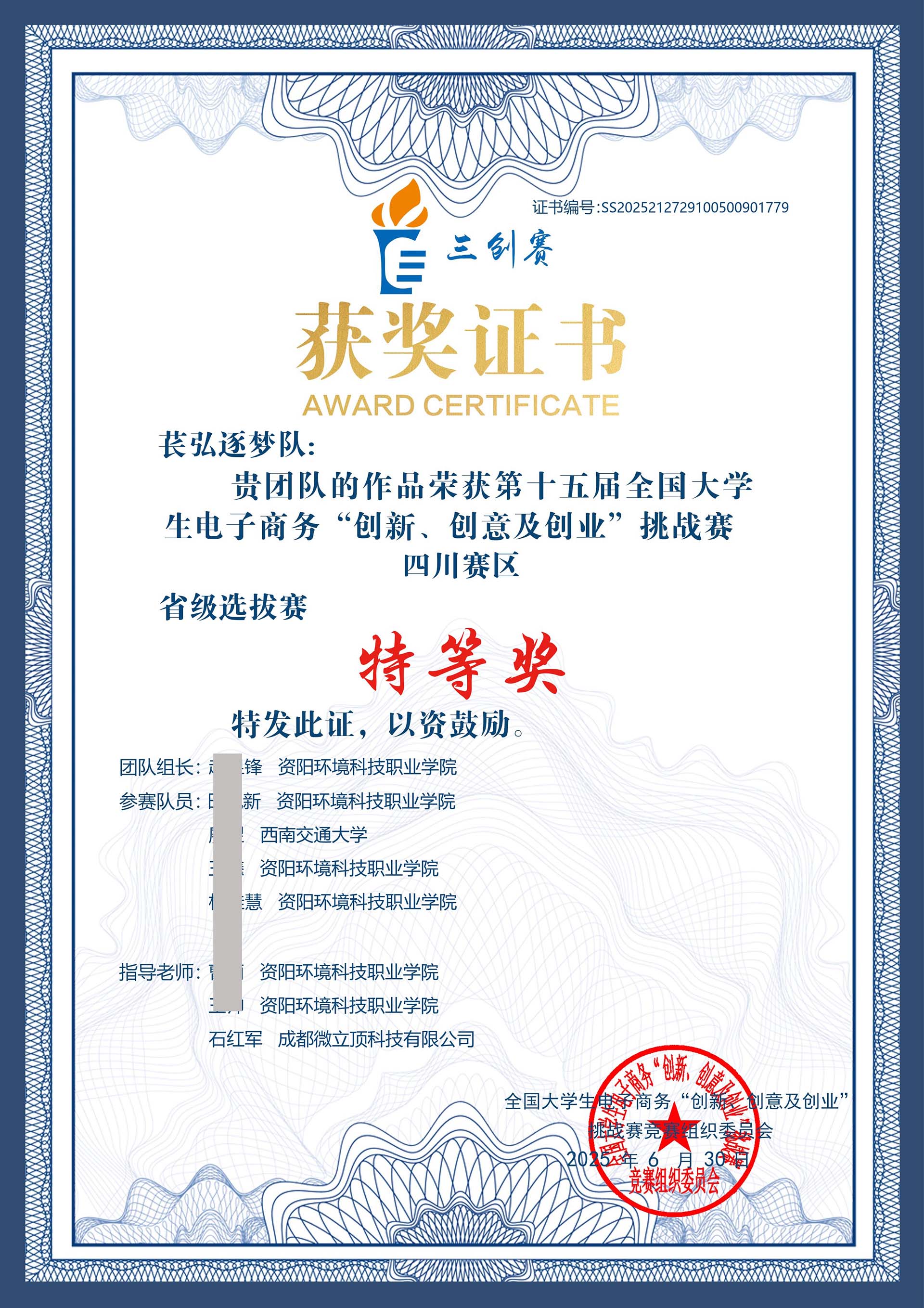 贺喜!荣获第十五届全国大学生三创赛省特等奖