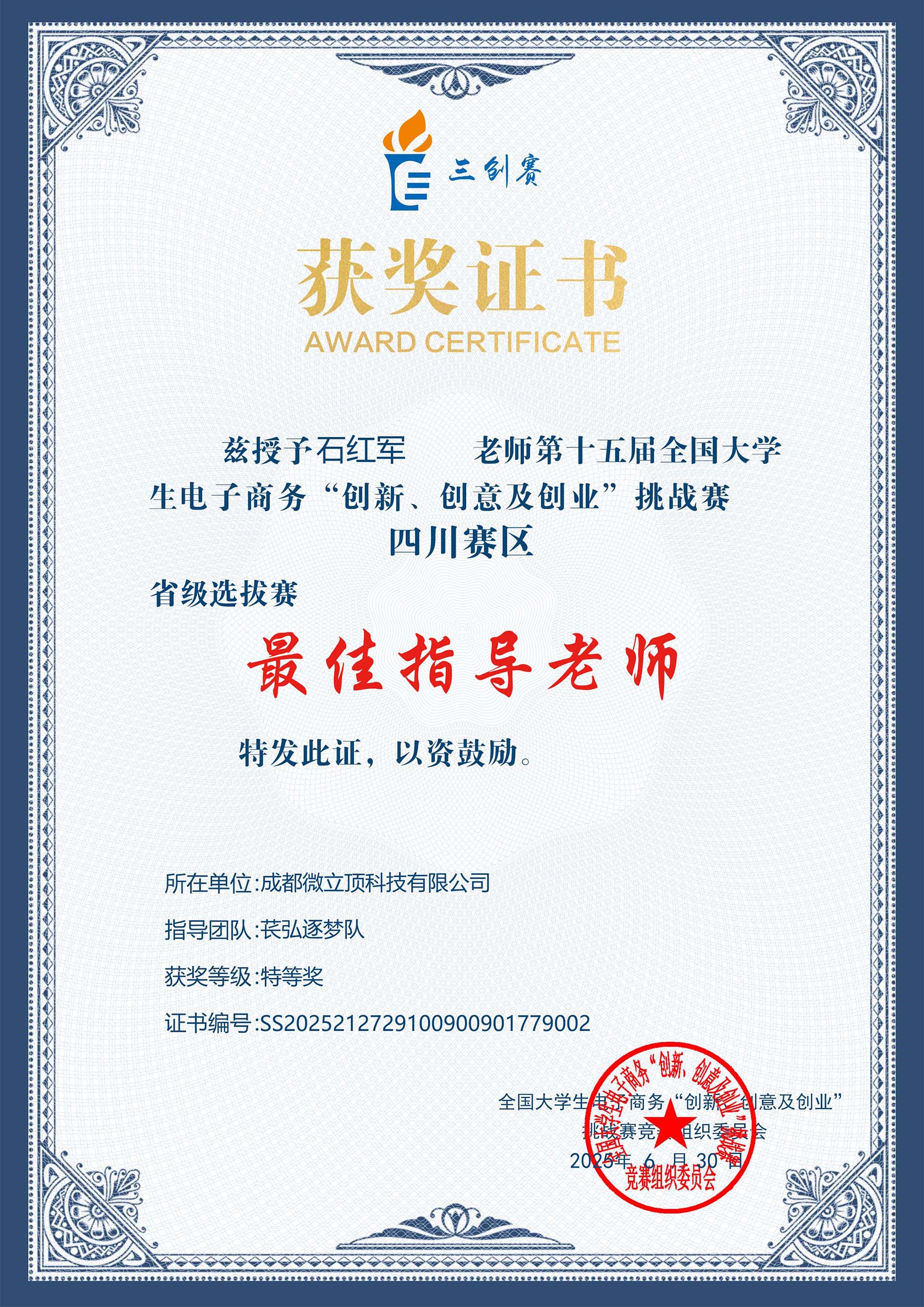 贺喜!荣获第十五届全国大学生三创赛省特等奖、最佳指导老师