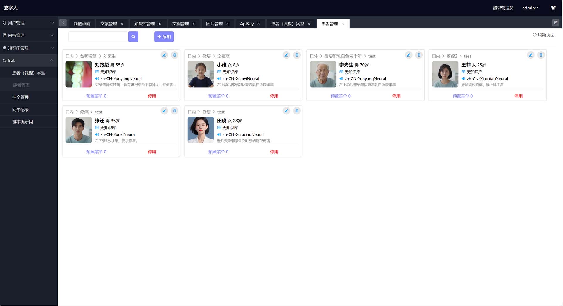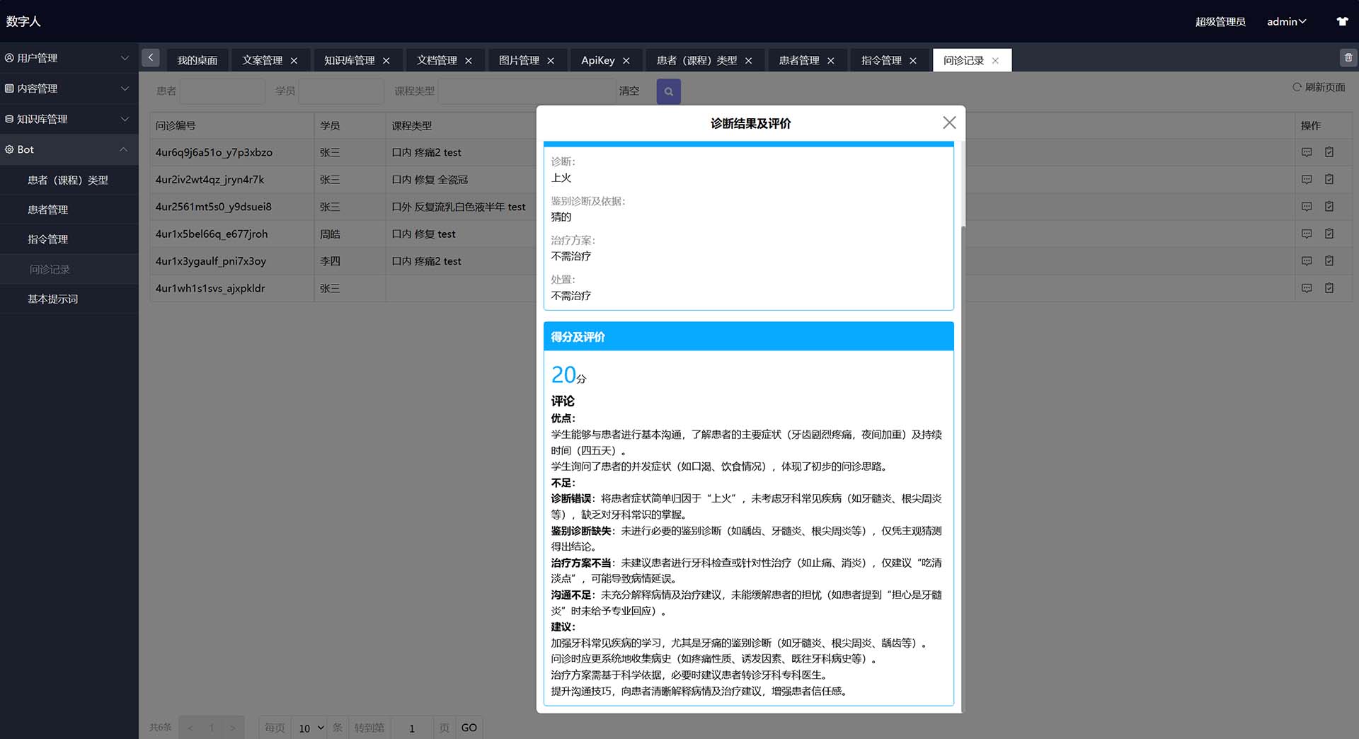支持蓝牙调度舵机的AI医学教培数字人,可以实现数字人形象管理、人设管理、知识库管理,支持流式对话、对讲机式对话、文字对话,支持考评打分和评价等,支持自定义命令控制舵机动作等。