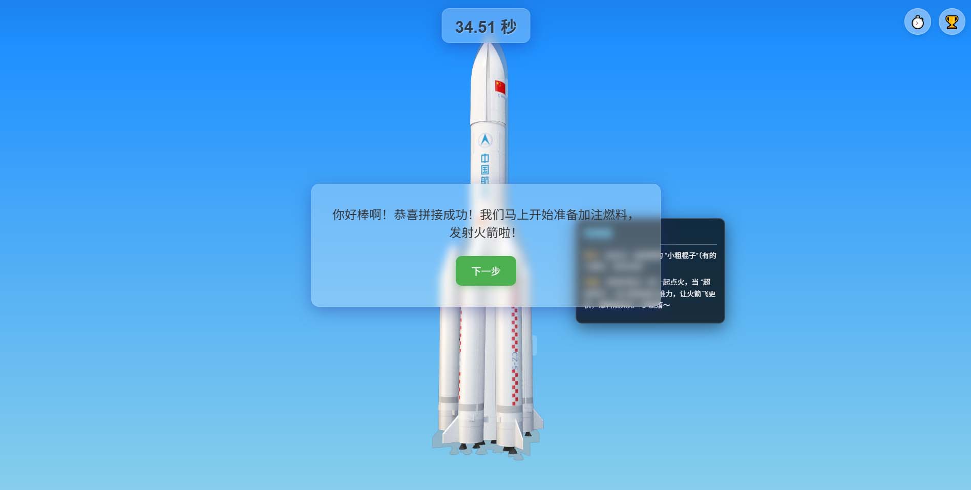 某北斗卫星科普展馆的火箭拼接发射大闯关游戏效果