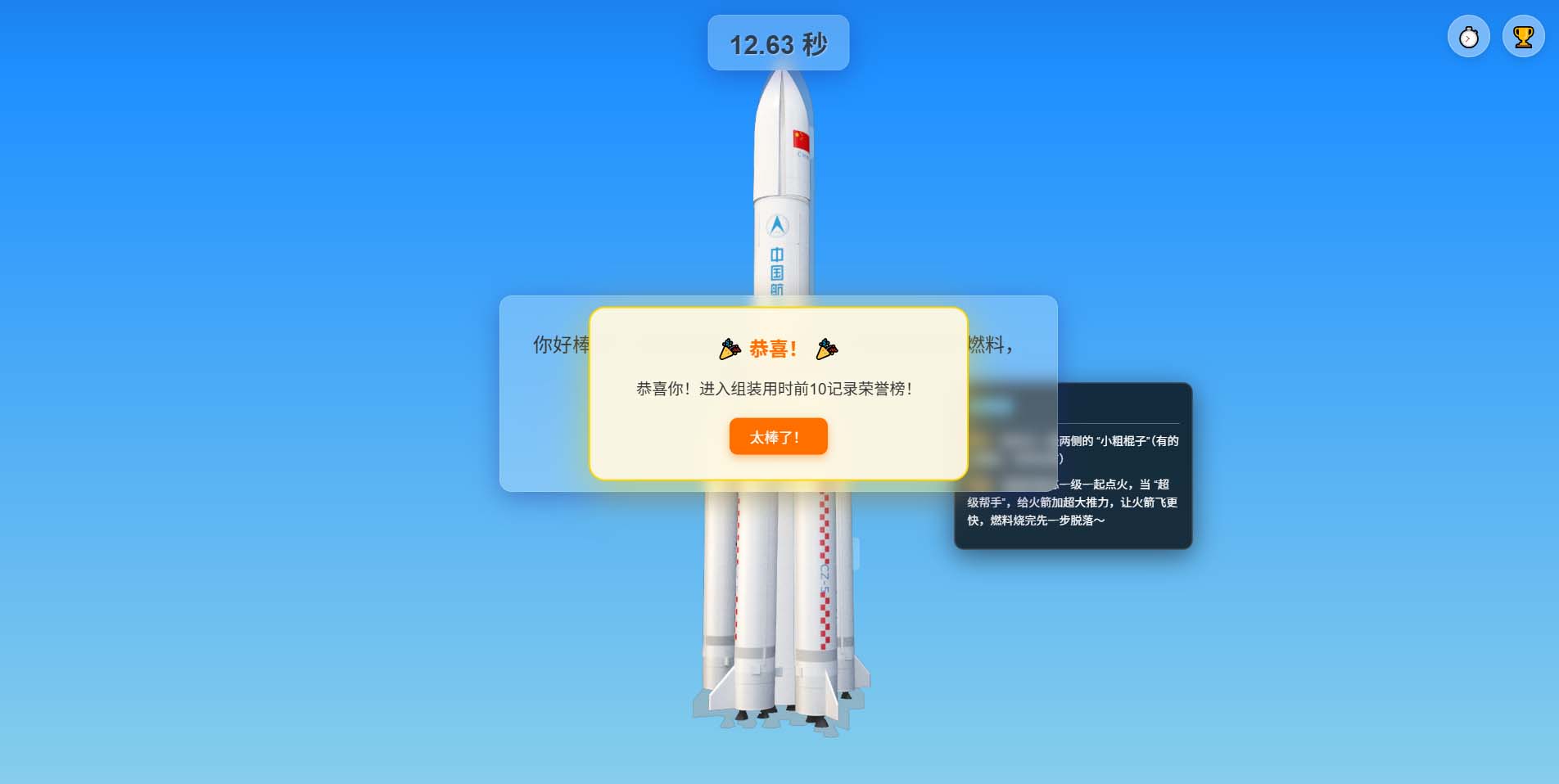 某北斗卫星科普展馆的火箭拼接发射大闯关游戏效果,支持拼接、设置燃料、发射倒计时、自动掉落助推器、自动掉落芯一级、自动掉落芯二级、不同高度的背景切换、组装排行榜、发射排行榜等