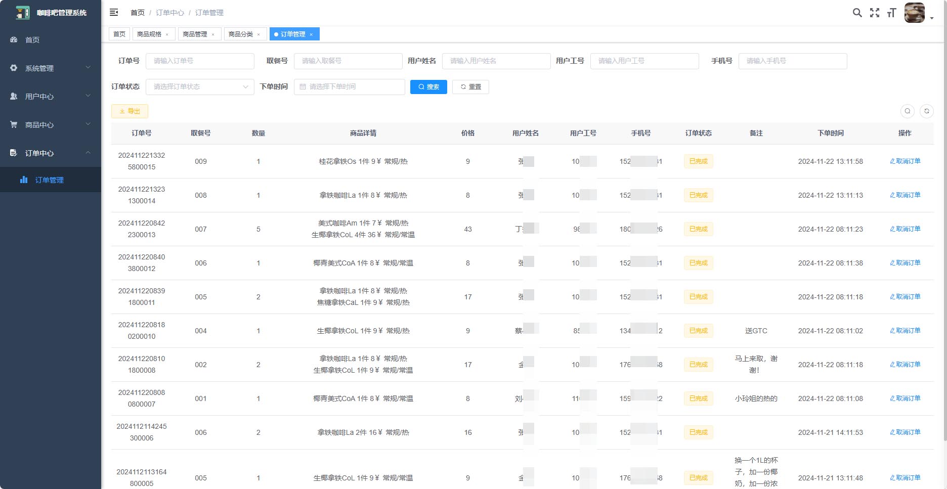 管理端 是系统的设置管理部分,系统管理主要包括系统用户管理、角色管理、部门管理和岗位管理,用户中心主要是员工信息认证和微信用户信息绑定,商品中心主要是包括商品类别、商品规格和商品信息管理,订单中心完成订单管理。