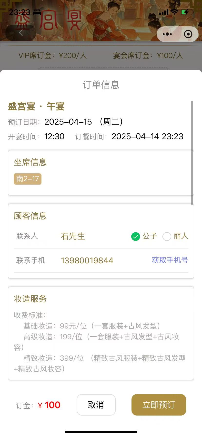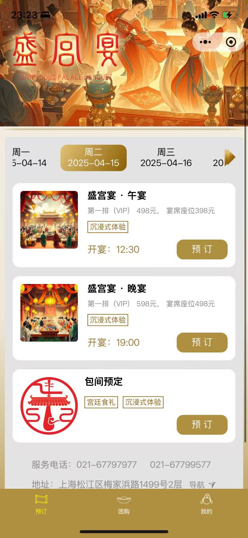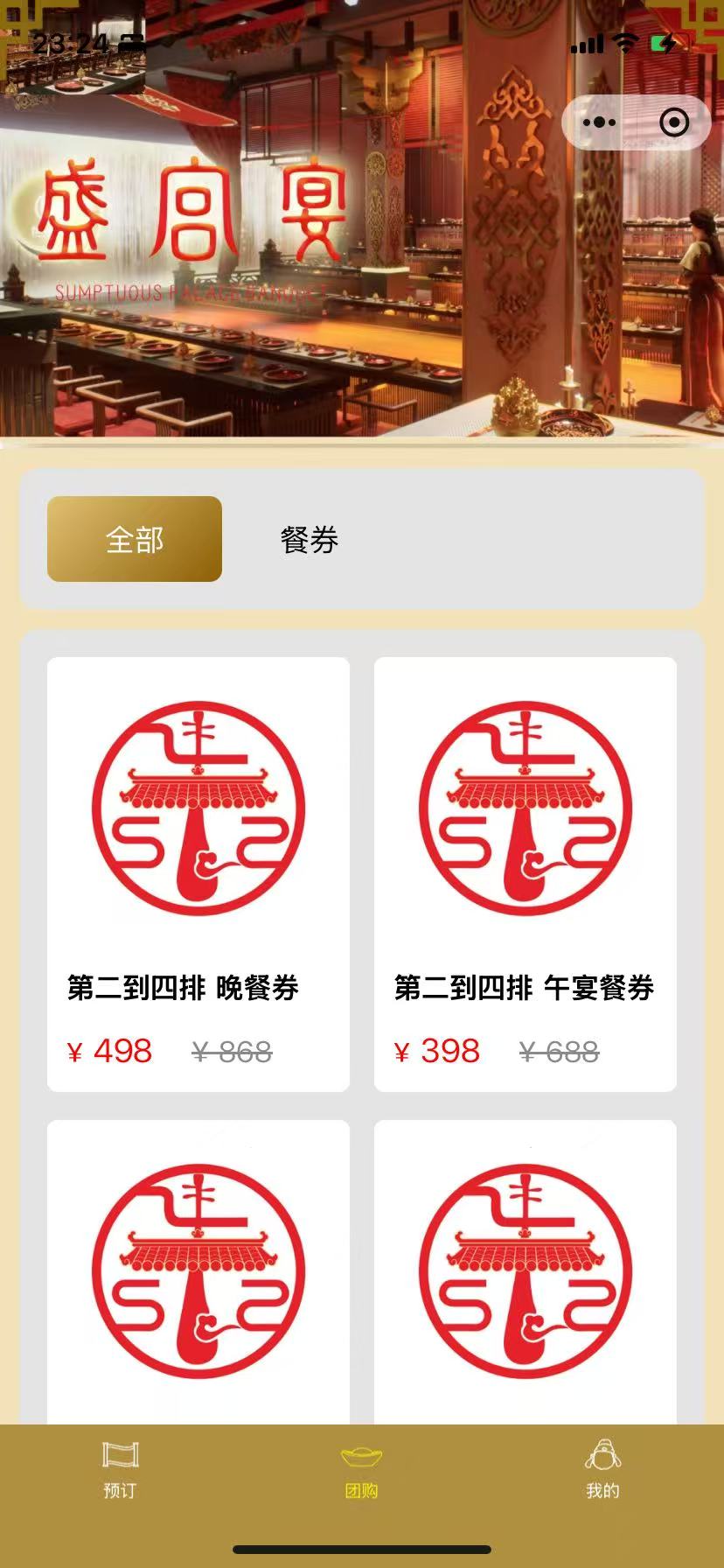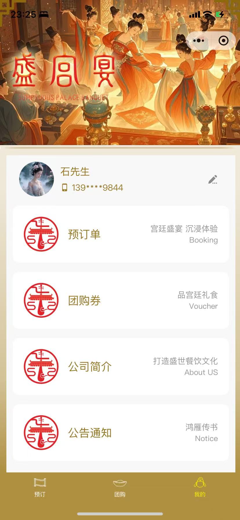 盛宫宴小程序,主要实现企业的形象宣传,在线预订选座、选择服饰、预约拍摄服务等,以及购买抵扣券等,管理端支持在线核销券,对接富友通道实现支付。整体风格采用土豪金、宫廷风设计。