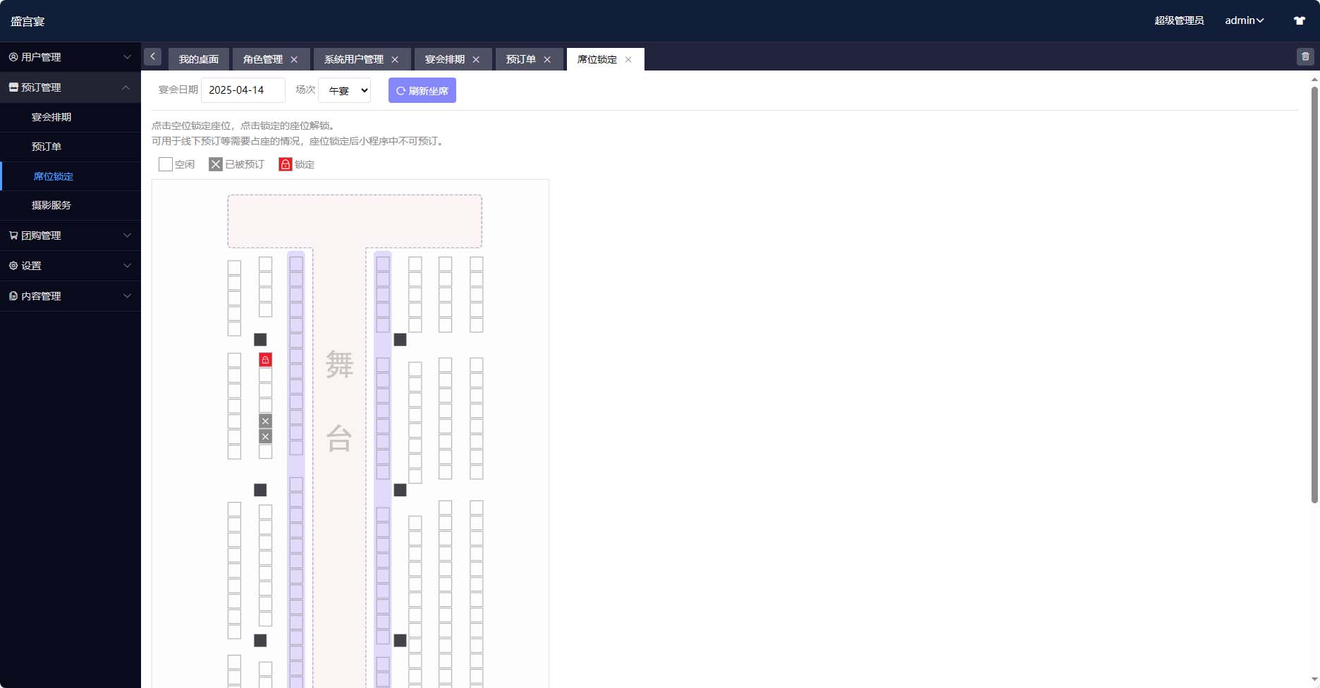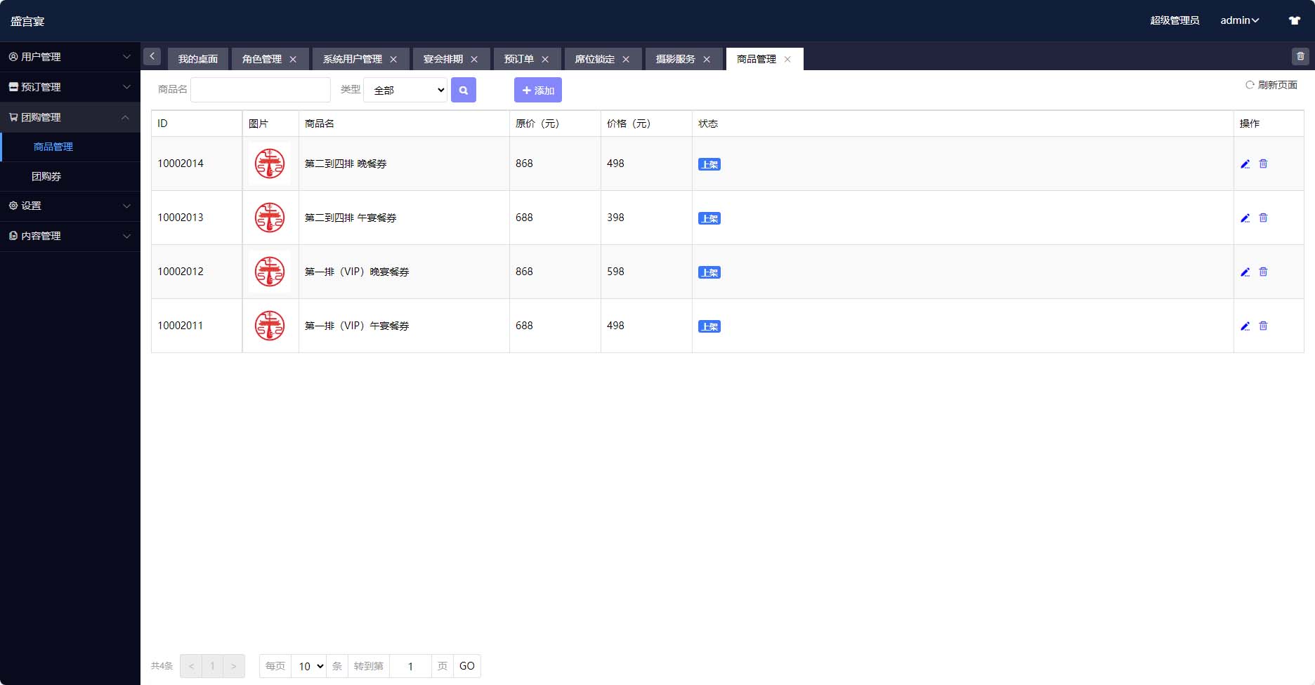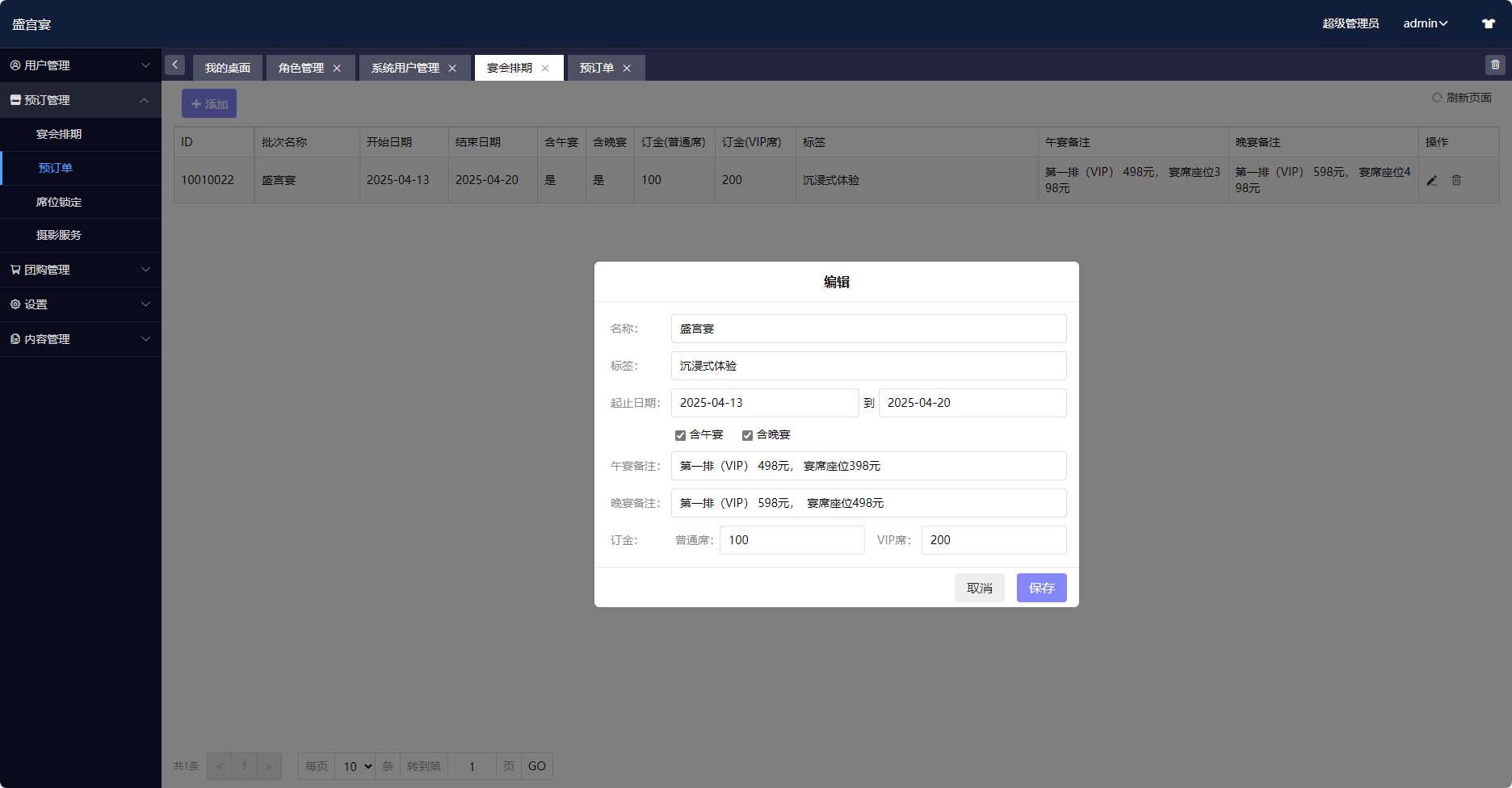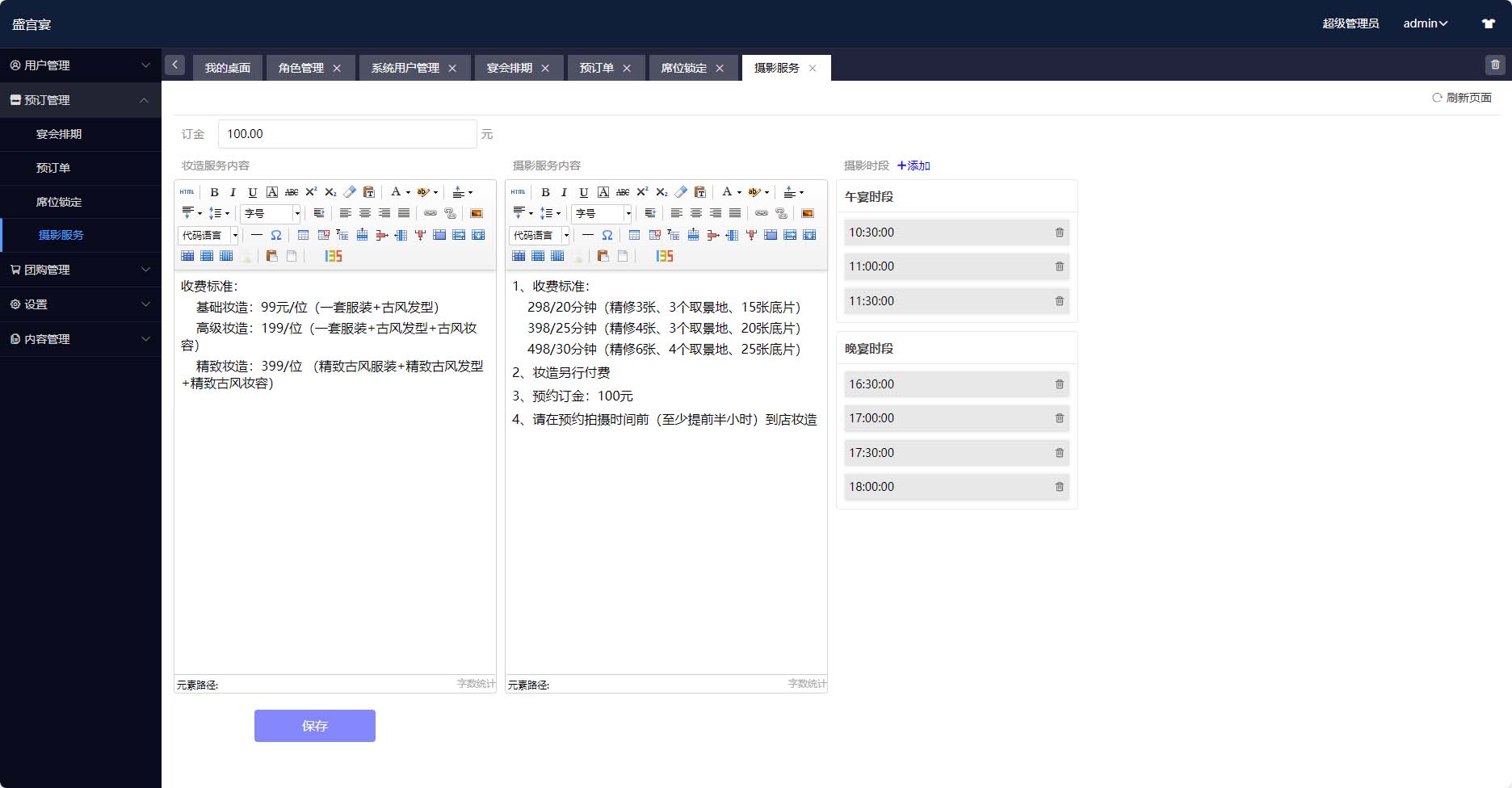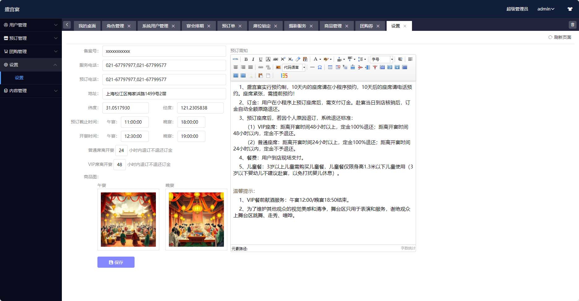 盛宫宴小程序,主要实现企业的形象宣传,在线预订选座、选择服饰、预约拍摄服务等,以及购买抵扣券等,管理端支持在线核销券,对接富友通道实现支付。整体风格采用土豪金、宫廷风设计。