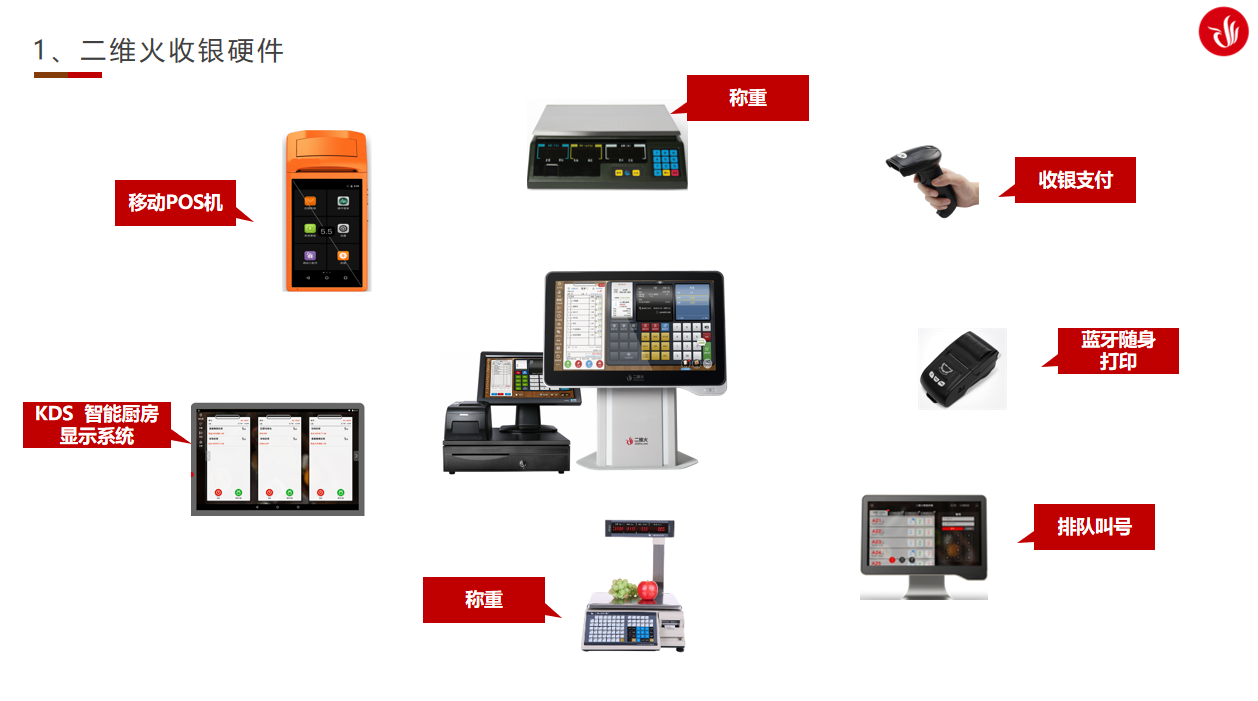 二维火商家智慧经营的五大模块包含了二维火智能收银系统(硬件+软件)、;零售餐饮混业经营全场景覆盖、AI人工智能应用(视觉识别火盘收银系统、自助机等)、基于大数据分析和用户画像以实现商家会员营销闭环以及餐饮零售进销存管理。