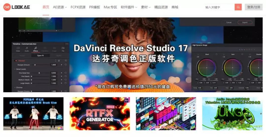 影视后期AE模板、音效素材、预设脚本等素材分享平台,涵盖比较多,有免费和收费部分。