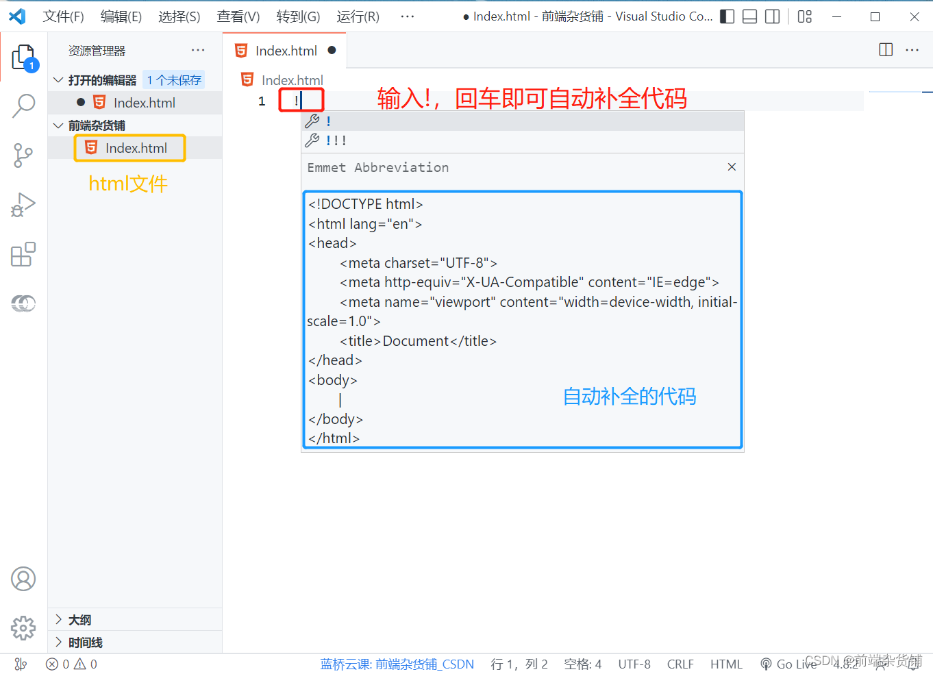 下载安装后,打开编译器,创建第一个文件 Index.html。