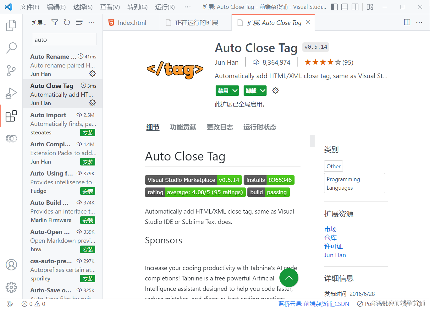 (3)Auto Close Tag:自动补全标签(不需要全部手写)