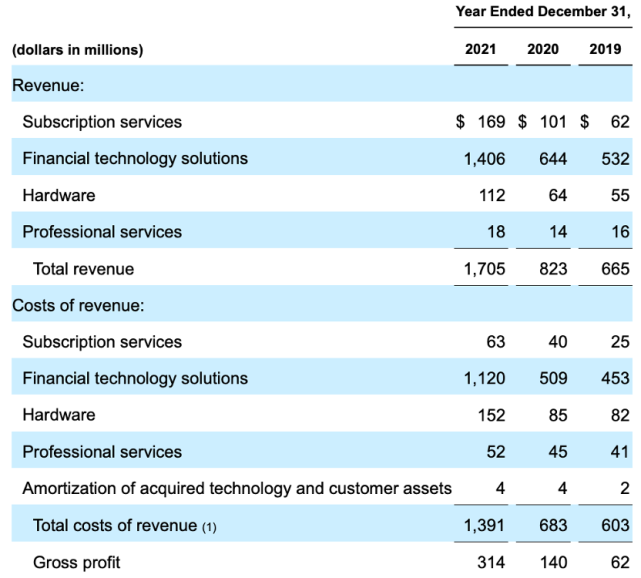 TOAST的业务收入来源主要是四个版块——订阅的服务、金融技术解决方案、硬件和专业服务,收入最大的来源是金融技术解决方案这里面一方面是交易订单收取的过路费,另外一个是金融贷款的收益,在2021年,TOAST的金融技术解决方案的营收有14亿美元,在总营收中占比为82%。