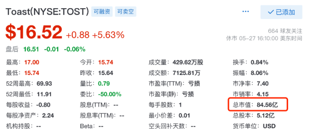 TOAST的市值前段时间有100亿美元(上市的时候,曾经到过320亿美元),最近又掉下来了,大概还有85亿美元(约570亿人民币);而港股上市的微盟,市值只有104亿港币(约89亿人民币)。