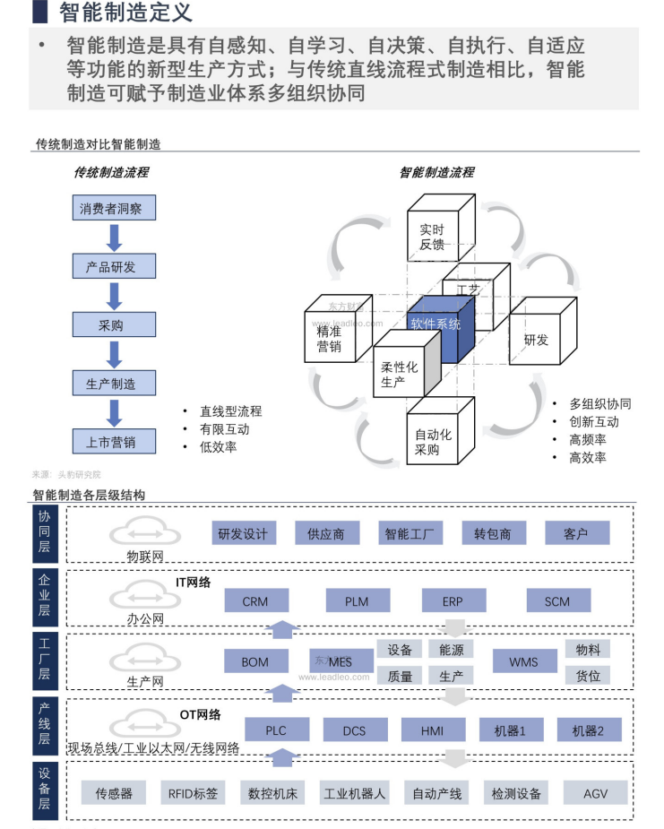 智能制造是具有自感知、自学习、自决策、自执行、自适应等功能的新型生产方式;与传统直线流程式制造相比,智能制造可赋予制造业体系多组织协同。