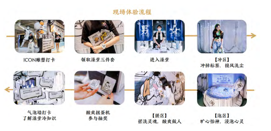 冲——泡——搓3大沉浸式互动体验版块、扭蛋机抽奖游戏、周年周边限量发售。破格以餐饮跨界澡堂,巨大反差刺激受众猎奇心理,以获得更多圈层的关注。通过太二独特的版画风,还原澡堂体验,保留强仪式感的男女宾入口、冲泡搓步骤,更易产生代入感,深刻感受到品牌所输出的文化价值观。在环节打卡卡片中,以有趣的文案简述酸菜冷知识输出传统酸菜文化内容,软性植入品牌产品价值点,改变受众对酸菜文化的刻板印象,加强受众对太二酸菜的认知与关注。在呈现形式上,坚持将“中国文化”和“年轻潮流”相结合,弱化产品的输出,更着重品牌价值观的展现,以更软性的方式体现产品内涵,保留了较高的消费者体验感。