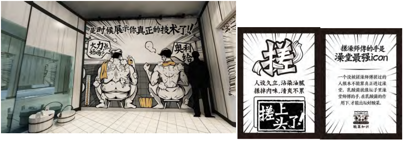 将日常搓澡的酸爽融进游戏中,酸爽体验和太二酸菜鱼强关联。戴上东北搓澡手套,化身搓澡大师对墙面人物背部进行搓洗。