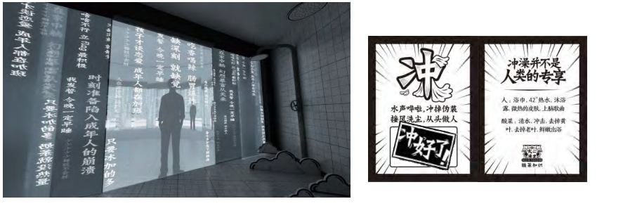 各种表达现代人的不良状态弹幕,冲掉成年人的不良状态,做回真实的自己。状态文案随雾幕从体验者的身体向下流,寓意如同洗澡时打开喷头冲掉汗渍一样。