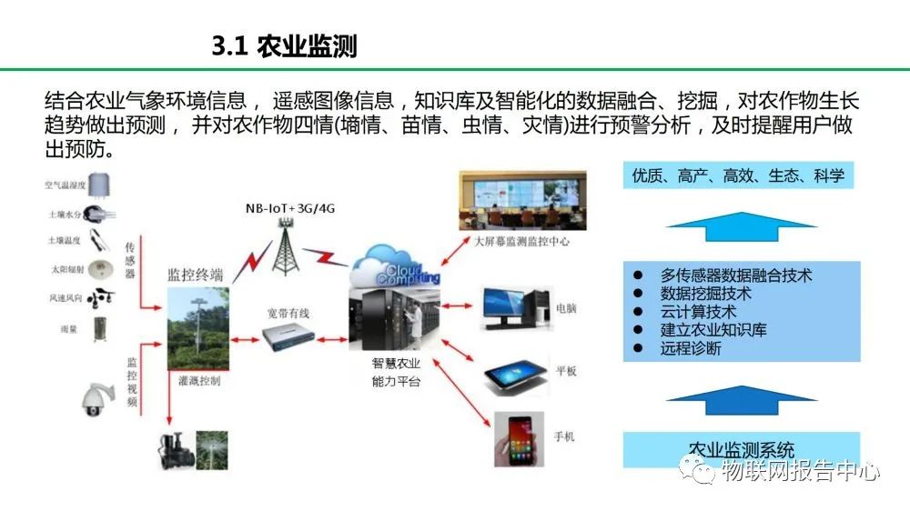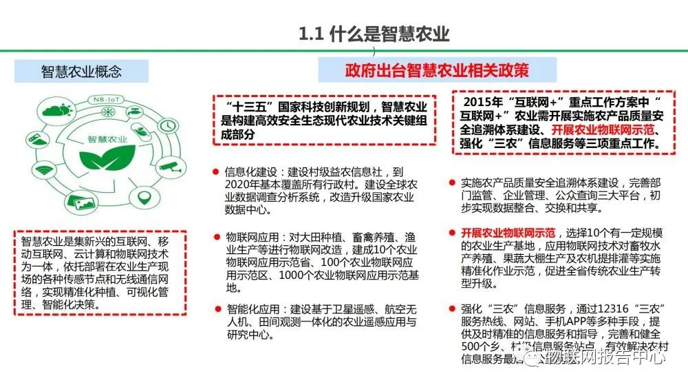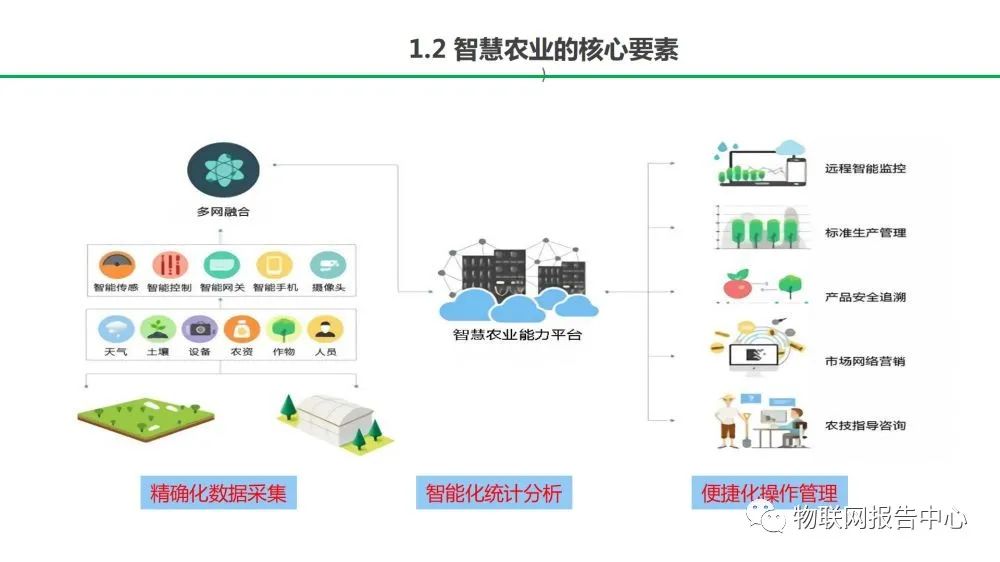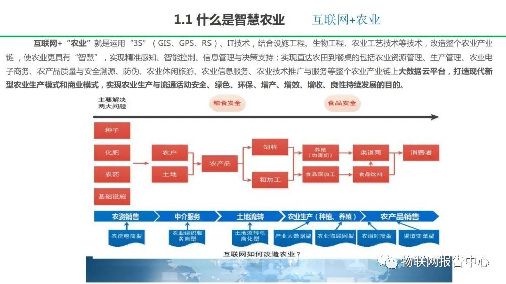 互联网+“农业”就是运用“3S”(GIS、GPS、RS)、IT技术,结合设施工程、生物工程、农业工艺技术等技术,改造整个农业产业链 ,使农业更具有“智慧”,实现精准感知、智能控制、信息管理与决策支持;实现直达农田到餐桌的包括农业资源管理、生产管理、农业电子商务、农产品质量与安全溯源、防伪、农业休闲旅游、农业信息服务、农业技术推广与服务等整个农业产业链上大数据云平台,打造现代新型农业生产模式和商业模式,实现农业生产与流通活动安全、绿色、环保、增产、增效、增收、良性持续发展的目的。
