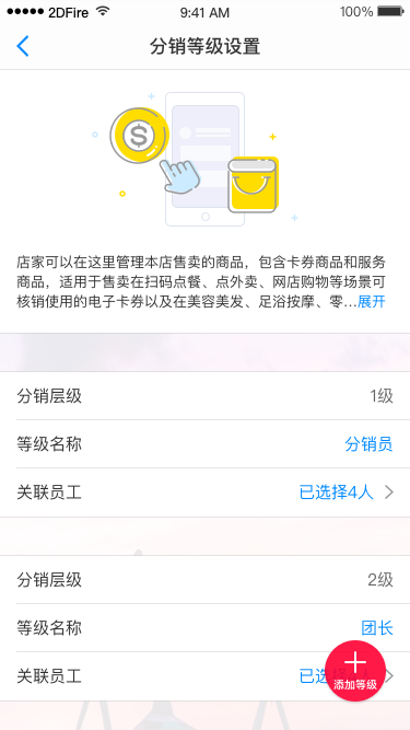 开通分销后,在【分销等级设置】中,设置不同的分销员等级,支持自定义等级名称和批量将店铺员工设置为分销员。