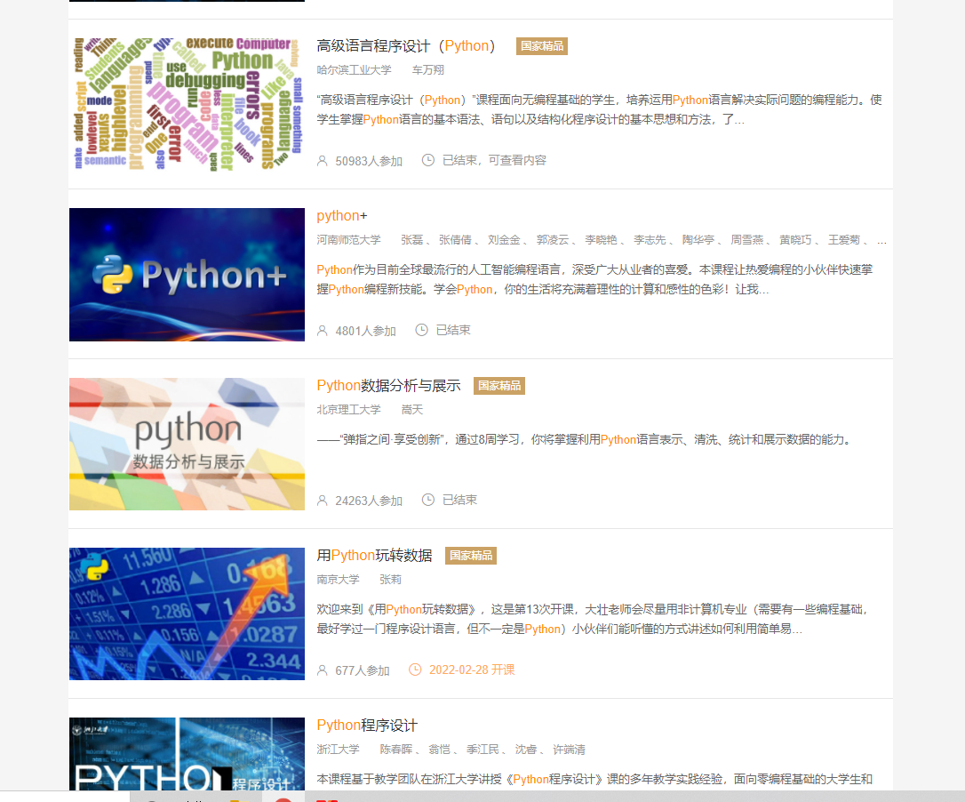 上面有很多免费的国家级编程课程,有些大学老师为了完成教师指标或者积攒声誉,就会在上面开设免费课程,比如你想学Python,可以去上面搜一下,上面有很多国家精品Python课程。