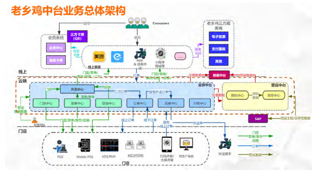4、 现有系统对接:业务中台与现有系统会有数据对接,包含:开票系统、发票信息、Pos 系统、菜单、订单、门店信息、会员 CRM、会员信息与积分、第三方卡券平台、卡券核销信息、SAP 系统、主数据、交易信息、门店中心、促销中心等。