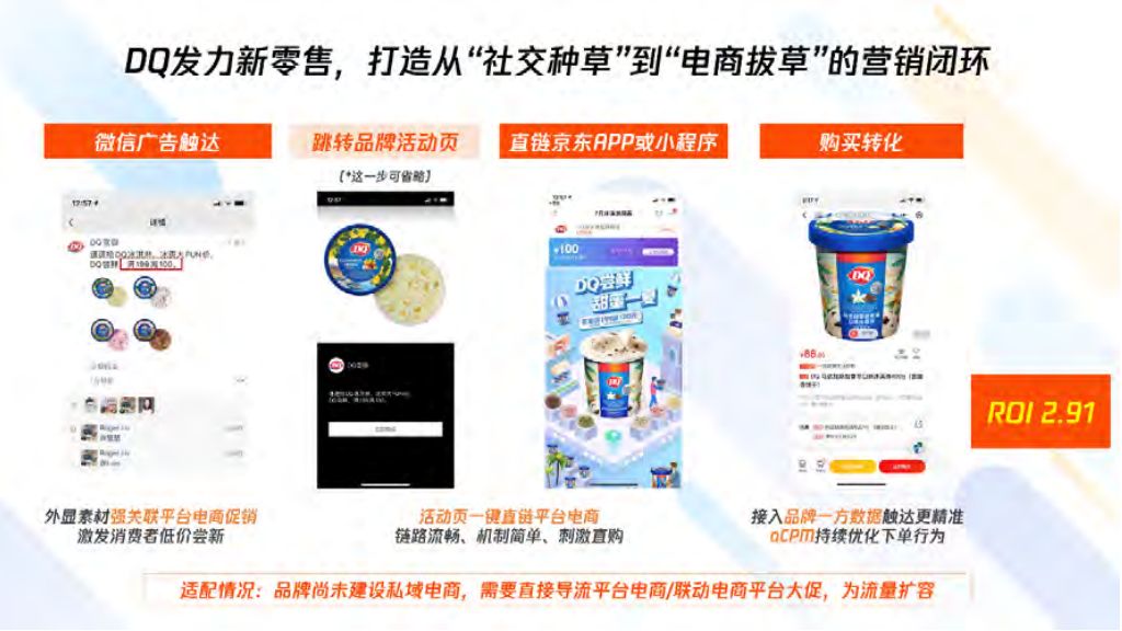 DQ 将京东的电商购物行为数据及腾讯社交行为数据进行融合,发挥两大平台优势对品牌的高潜消费人群进行了有效的心智影响和后端转化激励,从而促使广告仅上线五天,就实现了购买 ROI 2.91 的奇迹,DQ 京东自营旗舰店销量更是翻番。真正摸索打造了前端利用腾讯社交平台对消费者进行【内容种草】,后端利用品牌京东自营旗舰店承接【拔草】转化的闭环玩法;