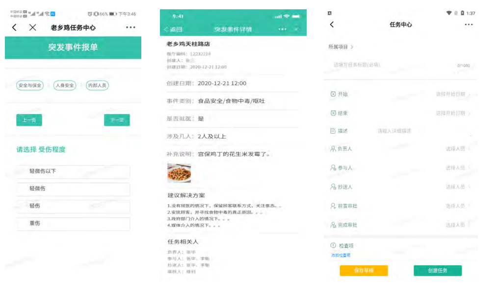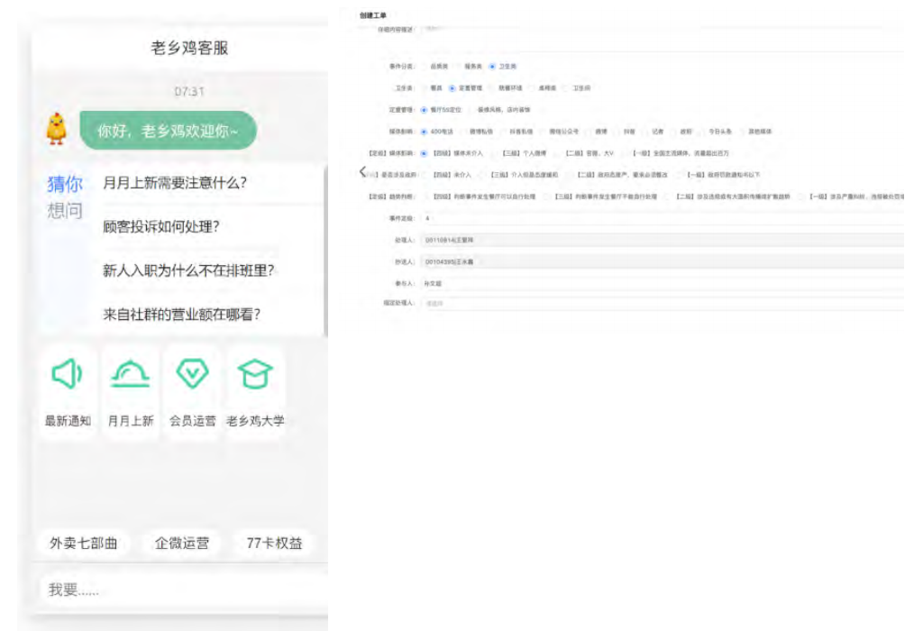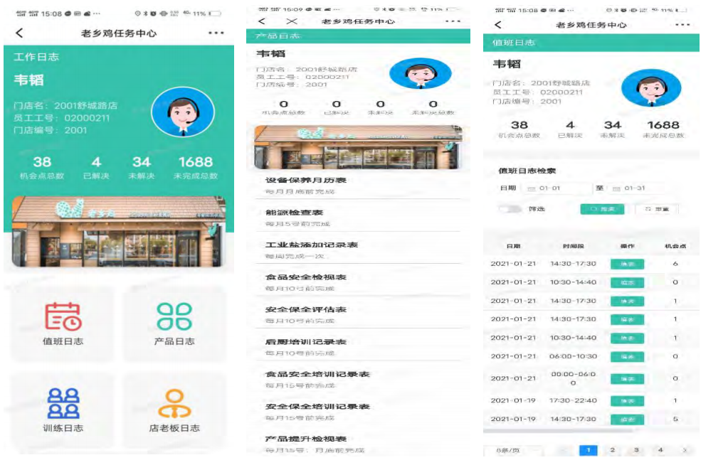 老乡鸡全国门店众多,之前都是以线下办公为主,信息化水平比较低,于是围绕着如何为门店提供数字化赋能,通过信息化手段提高门店工作准确性和效率,以及打通各相关业务的信息壁垒,成为必须攻破的课题。通过不断地收集现有线下业务,通过分析和梳理规划,从 2020 年底开始陆续建成门店突发事件、门店工作日志、门店巡检日志、客服系统、任务中心系统。