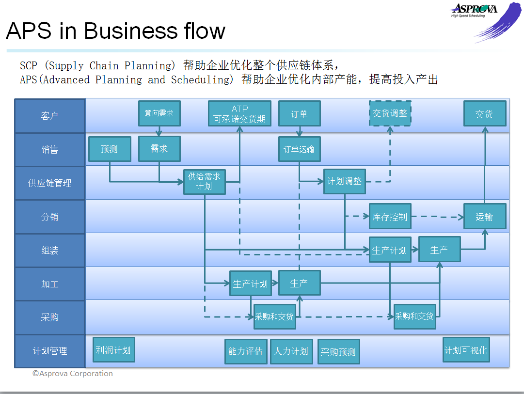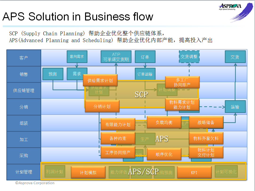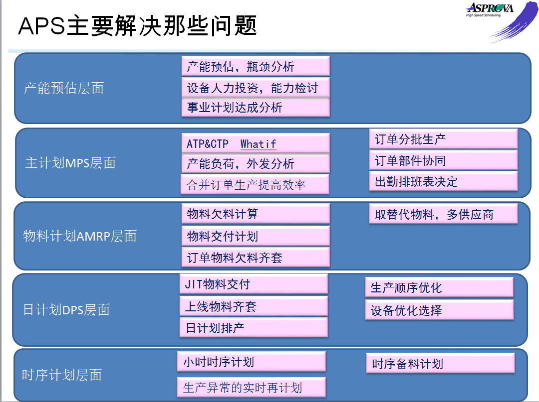 APS系统是根据APS核心理论(有限能力与TOC理论)而开发的先进计划与排产系统。系统面向离散性的制造业企业的生管提供详尽的车间生产排产建议,使得生管能快速对生产问题进行决策,并且迅速根据用户需求的变化进行计划重排。与传统意义上的ERP系统相比,APS生产排程系统在计划、排程、物料、车间管控等方面实现了真正的信息化管控,从管理层次上帮助企业快速合理调配物料、设备、人员等生产资源,实时反馈生产进度及异常情况,确保订单准时交货,快速响应客户需求,实现了有限产能条件下的交期预测、产能平衡、工序详细生产计划,从本质上帮助企业提升市场竞争力和应变能力。