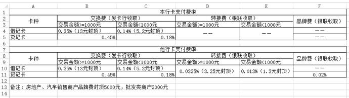 因为它不同于微信、支付宝通道统一费率的原则,银联会根据C端用户支付时使用的银行卡借贷性质和交易金额是否大于1000作为费率规则,并且还会收取额外的品牌服务费,详情参见下图。