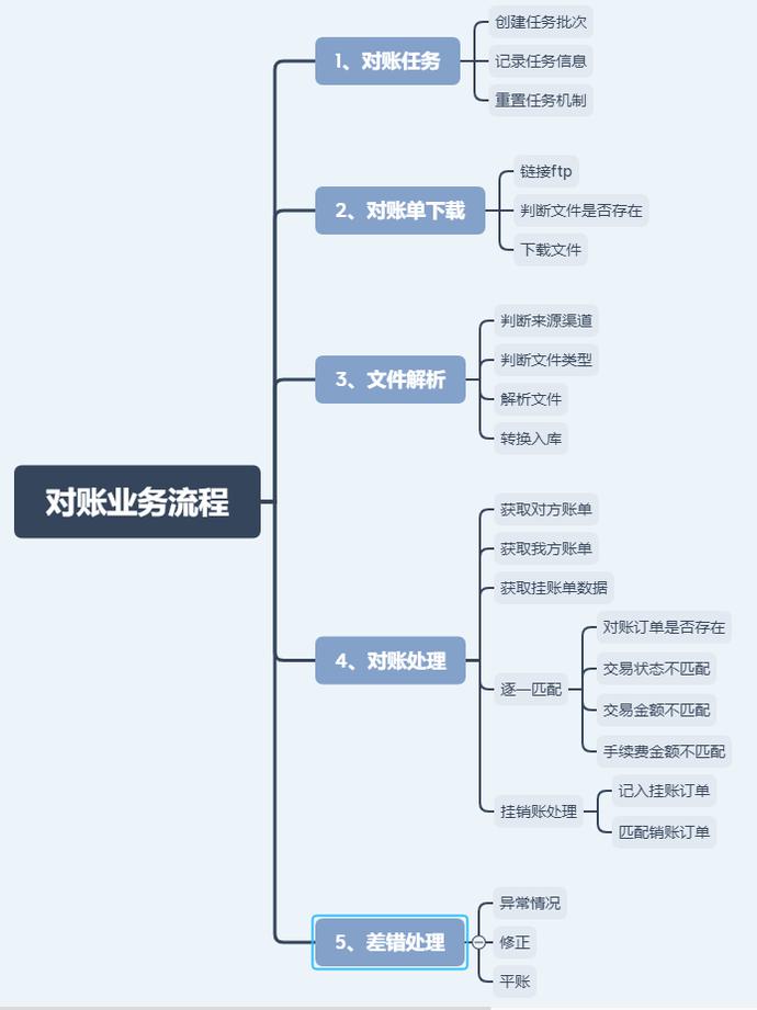 对账业务可以插解为5个业务环节,本文主要说明每个环节的能力职责、常见问题和通用解决方法,具体的产品方案还需要结合读者平台自身的业务特点和系统架构设计。