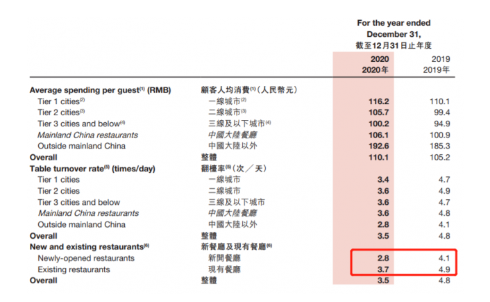 新门店的营收虽没有具体数据披露,但翻台率的缩减能一定程度体现新店的经营状况。巅峰时期的海底捞,平均翻台率在5次/天,远高于行业水平。而到了2020年,新开门店的平均翻台率由4.1次/天下降至2.8次/天,2021上半年则只有2.3次/天,同期也都低于老门店的翻台率。