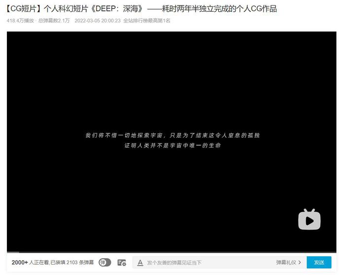 B站又出爆款视频了,这次是一个动画短剧《DEEP:深海》,上线数日后收获播放量超过418万,弹幕2.1万,全站排行榜最高第1名。