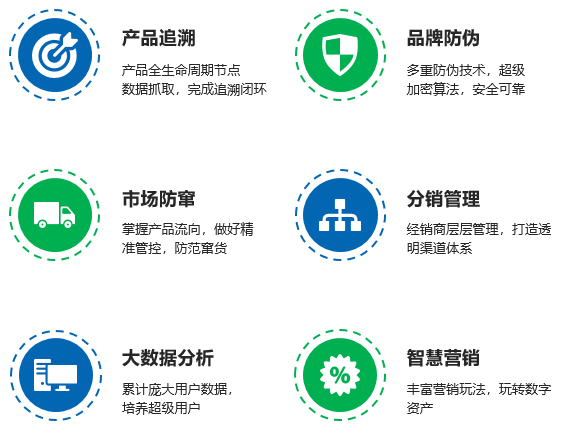 溯源码常见的应用场景示意,如果产品有周期节点,还可以附带售后和保养等交互互动功能。
