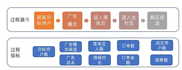 基于这两个原则,以广告曝光过程为例,在这个过程中我们可以用广告曝光渠道、广告成本等指标来描述该过程。同样的,像停留时长、用户数、各环节转化率等指标在每一个过程中都会存在。