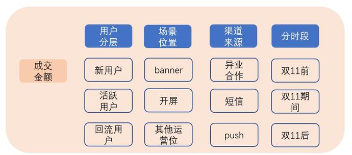 确定北极星指标、子指标、过程指标后,我们还需要添加分类维度,来完善指标体系。一般添加分类维度按照业务维度进行拆解。在我们的这个场景里,成交金额可以按照不同的特征去描述。