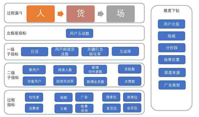 知乎是社区类的产品,这个时候我们的业务逻辑并不是像电商场景是一条清晰的漏斗,这个时候我们的过程模型就采用“人——货——场”模型或“AARRR”模型,并以此为基础来拆分过程指标。