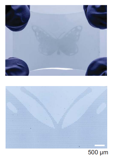 图2:拓扑超分子网络允许大面积、高密度可拉伸电极阵列的直接光图案化