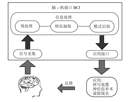 脑机接口系统的构成和其他通信控制系统并无本质区别,都由信号采集部分,信息处理部分和输出应用设备三大部分组成。