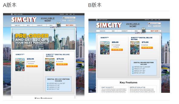 今年,EA公司发布新版《模拟城市》(SimCity)游戏时,在网站做了一个A/B测试,以便试验转化率在不同的布局下是否有变化。