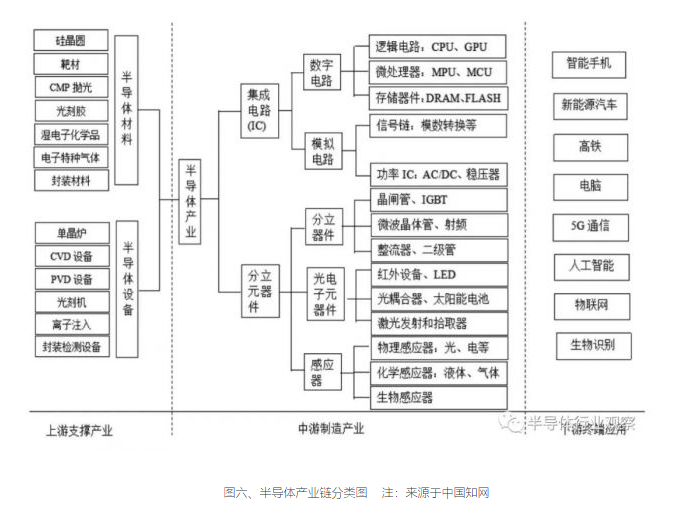 半导体产品中集成电路/芯片约占80%左右,半导体分立器件约占20%左右。由于半导体产品中大部分是集成电路/芯片,因此常常把半导体和集成电路/芯片混为一谈。集成电路/芯片的产业链上游主要是集成电路/芯片制造所需的原材料和生产设备。集成电路/芯片的生产工序主要涉及芯片设计、晶圆加工、封装和测试。集成电路/芯片主要应用于通信设备(包括手机)、PC/平板、消费电子、汽车电子等下游行业。