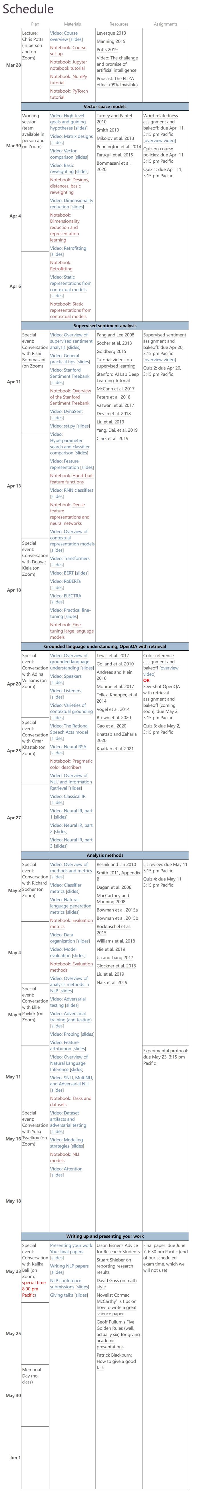 以下就是主要的课程主题了,该课程从今年 3 月份开始到 6 月份结束,囊括了自然语言理解的方方面面。每一个课程主题又会引出各种话题扩展,通过前沿论文进行讲解。该课程还提供了特别活动,允许学生与资深学者进行对话。每节课程结束,学生都有相应的作业要完成。