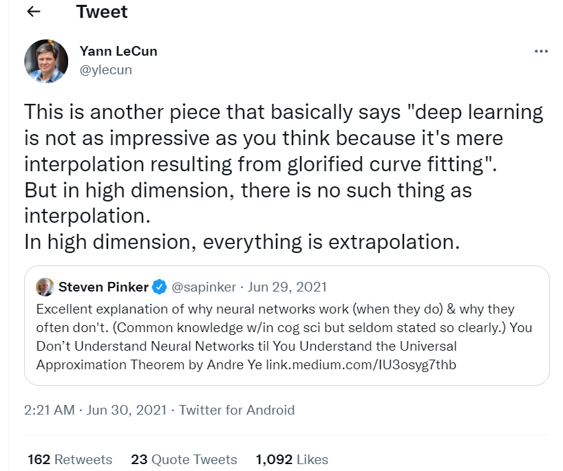 深度学习先驱 Yann LeCun(卷积神经网络的创造者和 ACM 图灵奖获得者)在他的推特上发帖(基于一篇论文):「深度学习并没有你想象的那么令人印象深刻,因为它仅仅是美化曲线拟合的插值。但是在高维中,没有插值之类的东西。在高维空间,一切都是外推。」因此,作为函数学习的一部分,深度学习除了插值,或在某些情况下,外推。就这样!