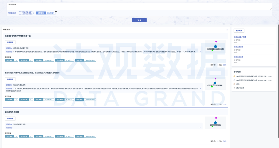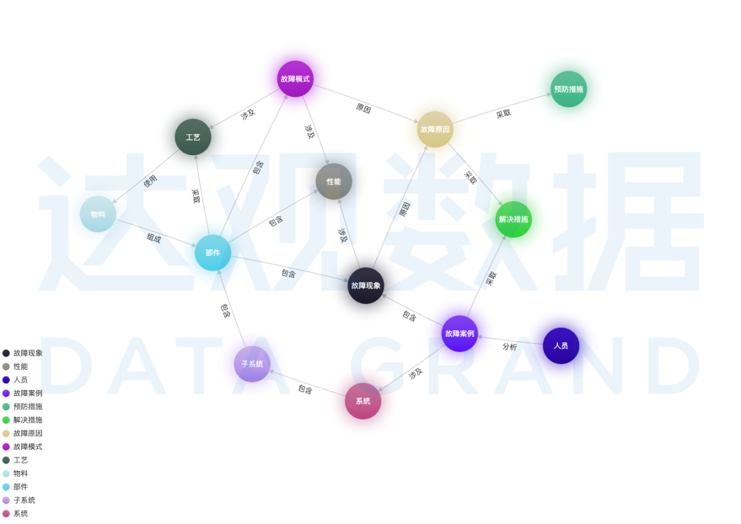 工业制造研发、制造、维修等流程涉及人机料法环的方方面面。从产品规划、设计开发、生产制造、维修反馈等各个阶段,失效分析都是其中重要一环,达观工业知识图谱失效分析重点解决过程中对故障原因的深度探查和推理,找出根因,推荐出解决和预防措施、相关案例等,赋能企业流程。