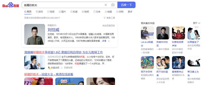 在智能问答方面,会通过知识图谱为你推理出答案。例如,你搜索“杨幂的前夫”,会直接给你返回“刘恺威”的信息。