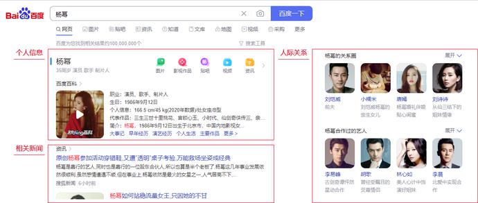 举个例子,你在使用百度搜索“杨幂”时,搜索结果除了包杨幂的个人信息及相关新闻以外,还给你展示了她的关系圈及合作过的艺人,这些人际关系信息都与“杨幂”这个关键字没有重合,但因为和“杨幂”这个实体有实际关系,所以都在“杨幂”的搜索结果中。