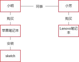 · 实体:小明、小芳、苹果笔记本、Lenovo笔记本、Sketch。实体一般是名词,表示的是人、事、物的抽象化对象。