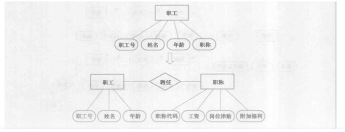 以下图为例:“职工”是一个实体,“职工号、姓名、年龄”是职工的属性,“职称”如果没有与“工资、文位津贴、福利”挂钩,换句话说,没有需要进一步描述的特性,则根据准则 1 可以作为职工实体的属性。