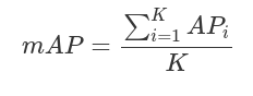 AP的计算只涉及一个类,然而,在目标检测中,通常存在K>1类。*均精度(Mean average precision,mAP)定义为所有K类中AP的*均值:
