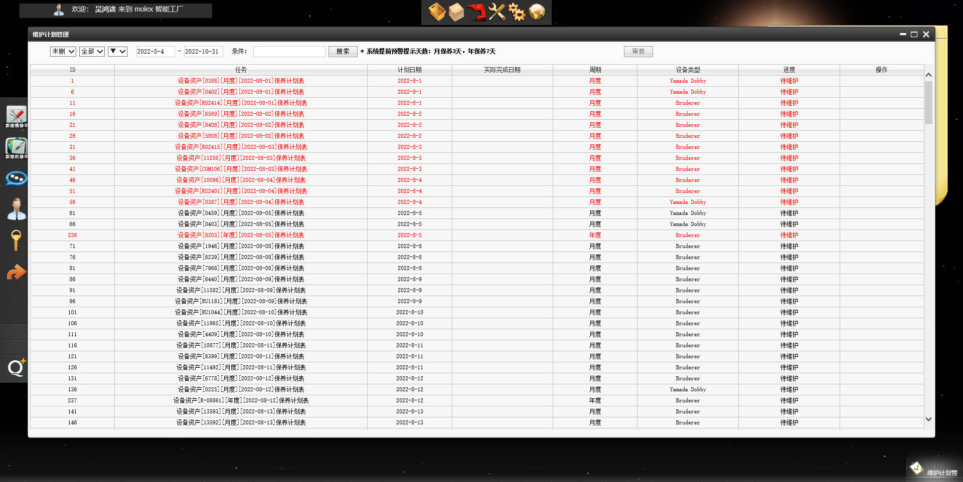 包括设备资产管理、设备保养维护、机修工单和模修工单等功能,以及数据报表和指标分析等。